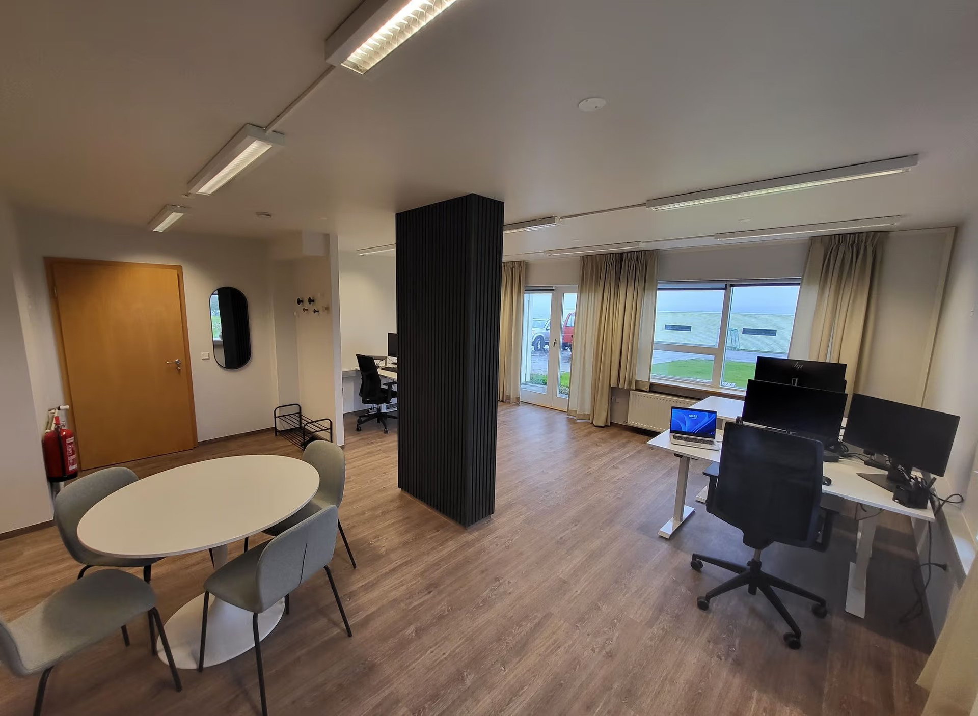 Eitt skrifborð er inni í skrifstofurými Akureyrarbæjar og hentar það vel undir lengri leigutíma. Stórt upphækkanlegt skrifborð, tveir skjáir, lyklaborð, mús og dokka bíða þess að þú mætir og tengir tölvuna þína við sig!